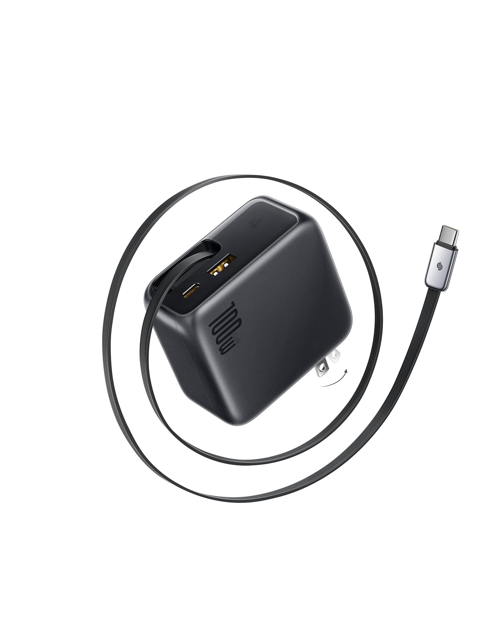 - 3-in-1 Retractable Charger: Features 1 USB-C and 1 USB-A port, with a built-in retractable 100W USB-C cable, and a foldable plug.