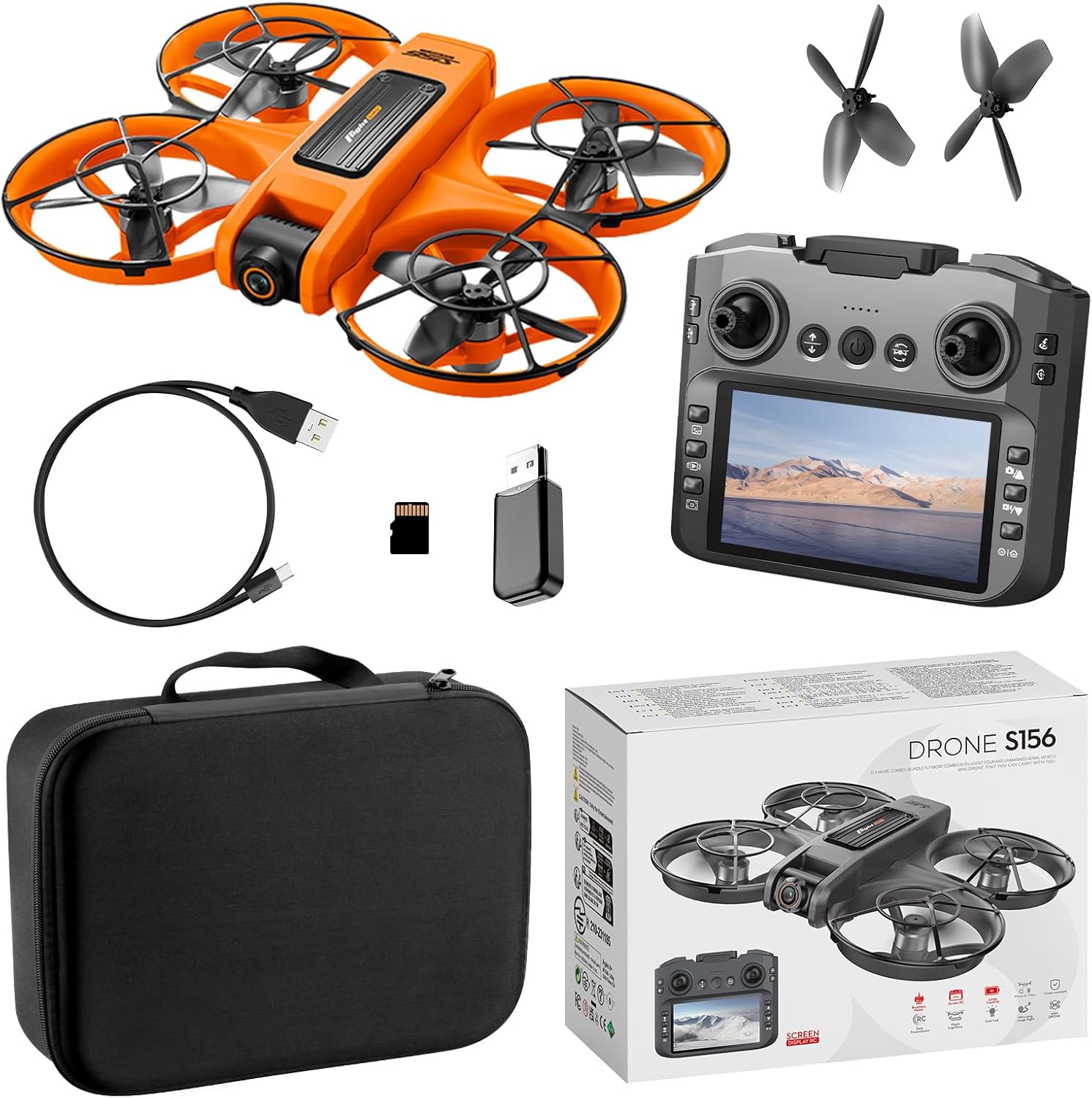 Figura 2.1: Contents of the S156 RC Drone package. This image displays the orange S156 drone, the remote control with an integrated screen, a USB charging cable, a micro SD card with a USB reader, two pairs of spare propellers, and a black storage case, alongside the product box.