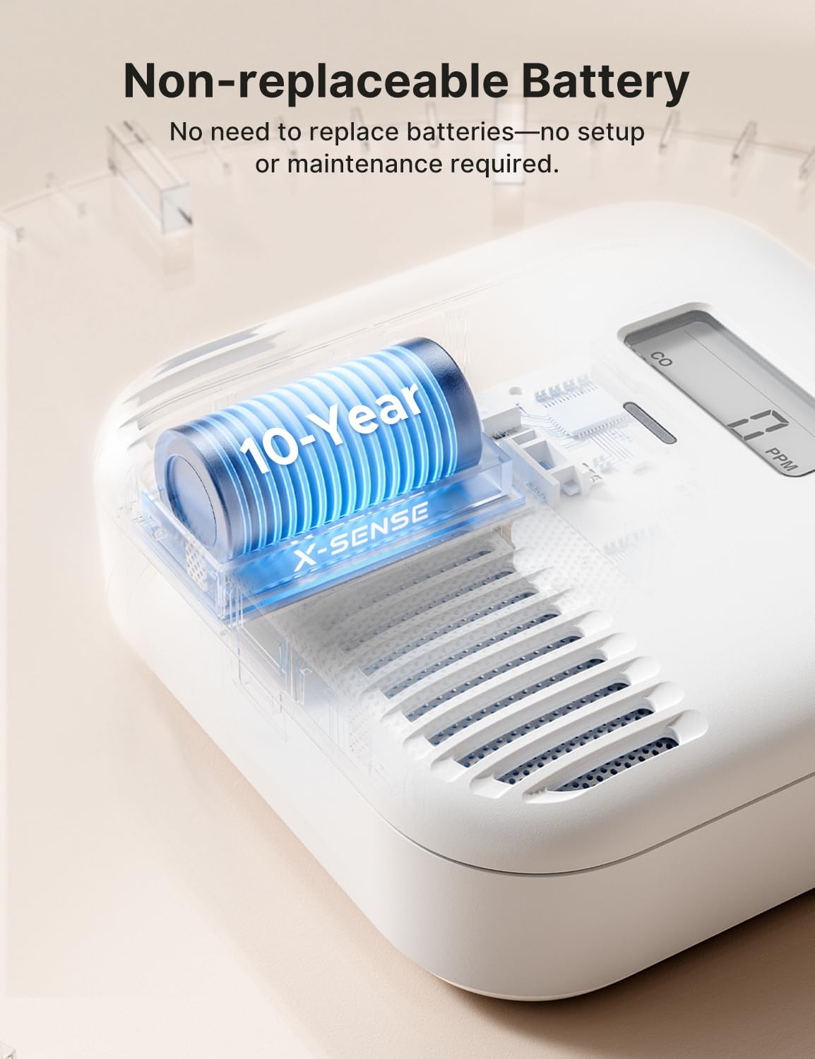 The X-Sense XC0K-SN Carbon Monoxide Detector is designed for minimal maintenance due to its built-in 10-year sealed lithium battery.
