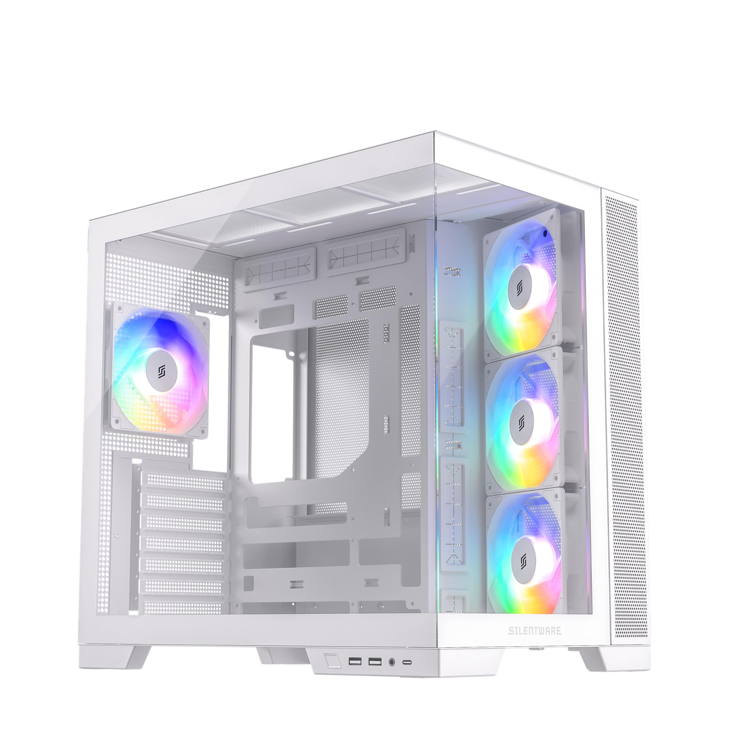 The SILENTWARE VIEWWHITE is a high-performance mid-tower PC case designed for optimal airflow and aesthetic appeal. It features tempered glass panels, four pre-installed 120mm A-RGB fans, and comprehensive compatibility for various PC components.
