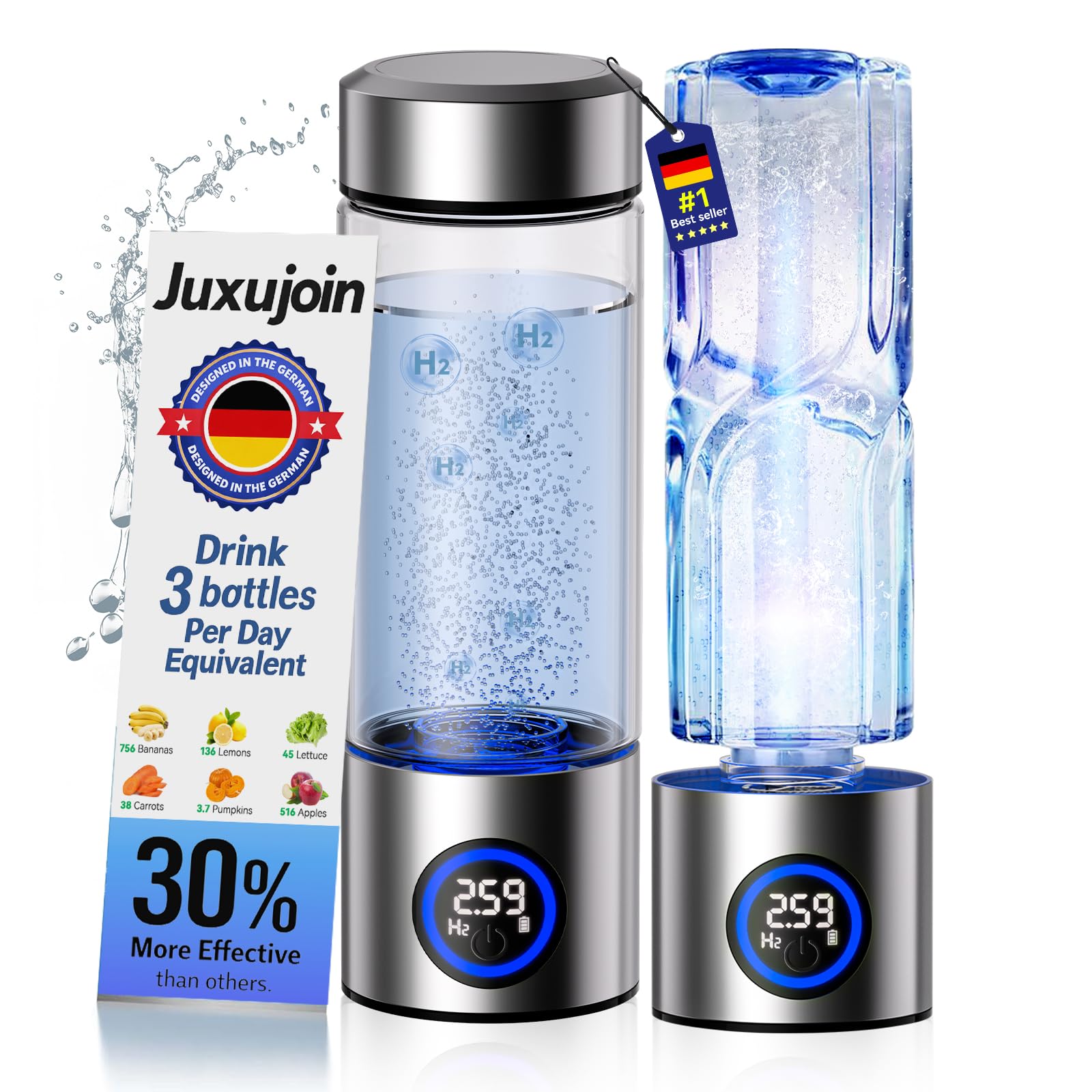 The Juxujoin Hydrogen Water Bottle Generator is a portable device crafted from durable borosilicate glass and stainless steel. It features a leak-proof design and an intelligent digital display. The generator produces up to 6000 PPB (parts per billion) of hydrogen in approximately 9 minutes, ensuring high-purity hydrogen water by separating ozone and chlorine.