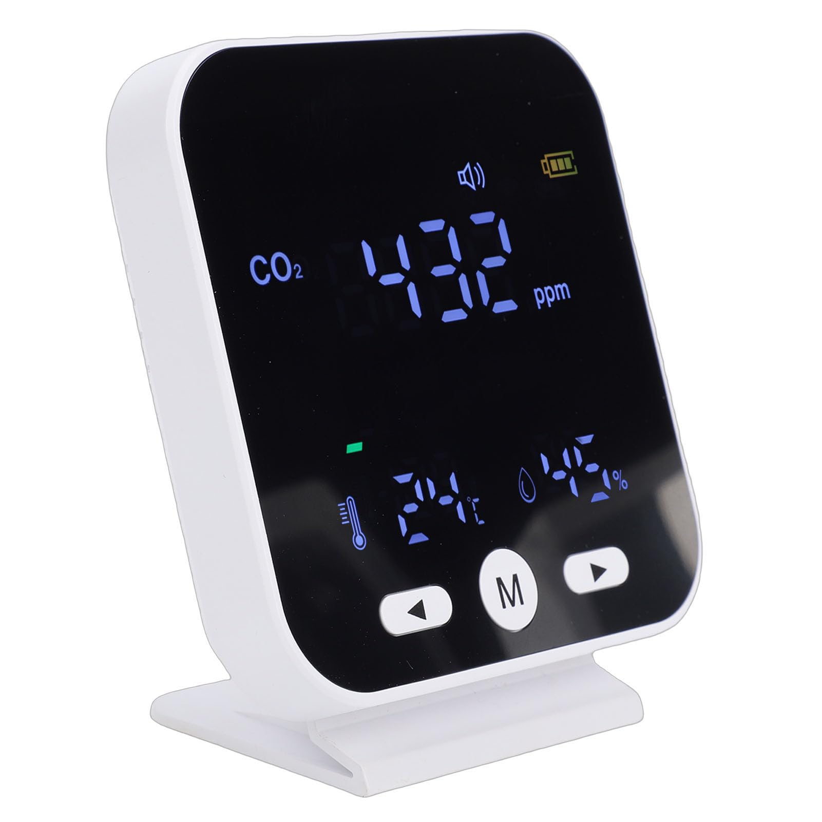 The device is equipped with an audible alarm and visual reminder when CO2 concentration exceeds a preset value (default 1000 ppm).
